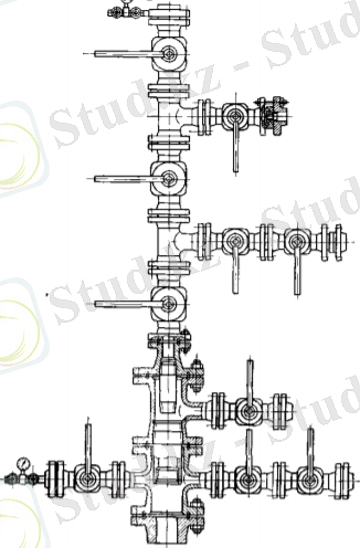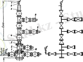 Cурет 10. Ұңғыма сағасының жабдықтары: а - тройник пішінді арматура: 1, 11 - фланецтер, 2, 9 - буферлер, 3 - вентиль, 4 - манометр, 5 - ысырма (задвижка), 6-крестовина, 7, 10-катушки, 8-тройник, 12- штуцер; б - крест пішінді арматура: 1 - фланец, 2 - қымтағыш, 3, 8, 11 - буферлер, 4 - вентиль, 5- манометр, 6-ысырма (задвижка), 7, 9-крестовиналар, 10- тройник, 12-штуцер, 13 - катушка, 14-фланец. 10-суретте екі катарлы құбырлар тізіміне арналған, кран түрлі ысырмасы бар тройник пішінді фонтан арматурасы көрсетілген. Шыршаның бүйірінде орналасқан крандар арқылы, топтап жинап өлшейтін құрылысқа немесе жинақтайтын құрылысқа құбырлар желісімен қосылады. Ұңғыманы фонтанды пайдаланудың ең дұрысы - негұрлым газ факторын аз ұстап өнім шығымының тиымды (оптималды) болуын қамтамасыз ету. Және де өнімді қабат құмнан тұратын жағдайда, ұңғыманың фонтандау кезіндегі сүйықтың сүзіліп жылжу жылдамдығын қадағалау қажет, ұңғыманың әдеттегідей жұмыс істеуіне құм кедергі болмас үшін, яғни ұңғыма оқпанына құмның ағып келіп шоғырлануын неғұрлым азайту керек. Фонтандау үрдісі кезінде ұңғыма өніміндегі мұнай мен су мөлшерлерін реттеп тексеру қажет, яғни бұл жағдай жиекті және табан сулары өнімді ұңғымаларына қарай үмтіліп жеткенде басталады. Жоғары өнімді ұңғымалар, үлкен диаметрлі оқпаны бар арматура мен жабдықталады. Газ ұңғымаларының сағасында термометр, қысым мен өнімді (дебит) реттетігіштер, автоматты клапындар қосылады. Автоматты клапындар ылақтырма желісінде, авария болған жағдайда. Мұндай фонтанды сөндіру және жою үшін екінші көлбеу ұңғымасын бұрғылау және онда атом зарядын жару қолданылады. Мұндай ашық фонтанның ауырлық дәрежесі, осы апатты шақыру себебі сияқты әртүрлі. Қабатты ашу және ұңғыманы игеру процесіндегі қиындықтар және ойда болмаған бұзулармен қатар, сағалық қондырғыда, соның ішінде, фонтанды арматурадағы бұзылыстар үлкен роль ойнайды, жалғасулардың тығыз еместігі немесе арматураның дірілдеуі салдарынан болатын бұзылыстар, ГСҚ ағынындағы абразивті қоспаның жеу қасиетінің нәтижесінде болатын үзілулер және «свищ» ауыр апаттың себебі болуы мүмкін. Оларды алдын-алу үшін, арматураны әрқашан екі есе сынау қысымымен (кейде біржарым есе) пресстейді, сонымен бірге, бөлек элементтер, және жиналған арматура процесстеледі. Cурет 11. Екі қатарлы құбырлар көтергішіне арналған тройник пішінді фонтан арматурасы Фонтанды ұңғымаларының жұмыс істеуін көбінесе штуцерлерді қолданып өнім шығатын желісте қарсы қысымды ұстаумен реттеуге болады. Штуцер дегеніміз ортасында тесігі бар цилиндыр немесе диск. Оның диаметры тәжиребе жүзінде аныкталып, ұңғыманың режиміне сәйкес тағайындалады. Штецердың диаметры 3 - 15 мм. кейде оданда үлкен болуы мүмкін. Штуцер желістің бойына ысырмадан кейін орнатылады. Манифольд - ысырмалармен немесе крандармен жабдықталған құбырлар жүйесі. Ұңғыма өнімі фонтан арматурасынан құбыр желісімен келіп манифольд арқылы топталған өлшеу қондырғысына (ГЗУ) жеткізіліп қосылады. Тәжірибеде бұл екі бірдей (жұмыс істейтін және резервке сақталған) байланысатын желісі бар жүйе. Оларға ретеуші штуцер, газ немесе сүйық үлгісін зерттеуге алауға арналган вентиль, өнімді жерге немесе факелге ылақтыратын ысырма қондырғысы және сақтауыш клапан орнатылады. Фонтанды ұңғыманың жұмысы кезінде болатын қиындықтар және олардың алдын-алу. Әр-түрлі кен орындар және бір к
