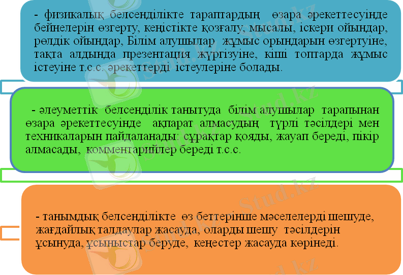 Интерактивті оқыту үрдісіндегі белсенділіктің түрлері: