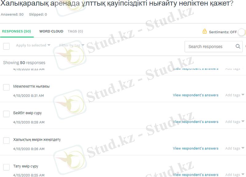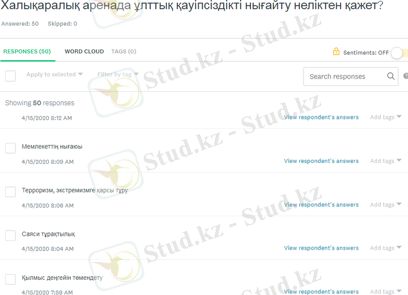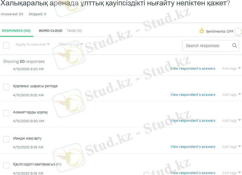 Келесі сұрақ терең ойлануды қажет етеді, бұл сұрақ респонденттердің мемлекеттердің ұлттық қауіпсіздігінің нығайту маңызы жайлы ойларын білуге бағытталған. Бұл сұрақ қатысушылардың ойымен ашық бөлісуге мүмкіндік берді. Жауаптарды зерттей отыра респонденттердің ойларының ұқсас келетіндігін аңғаруға болады. Яғни, әрбір мемлекеттің өз алдына қойып отырған басты мақсаты - әскери қақтығыстардың жосықсыз екенiн әлемнiң ұғынғанына зор сенiм артып отырғанымен, парасатты мемлекет басқа үкіметтердiң уәдесiне сенiп қана қоймай, өз елiнiң қуатына да сүйенетiнiн ескеру қажет. Сол себепті жауаптардың негізгі категориялары - мемлекетішілік пен мемлекетаралық жанжалдарды болдырмау мен қауіпсіздік шараларын нығайту болып табылады.