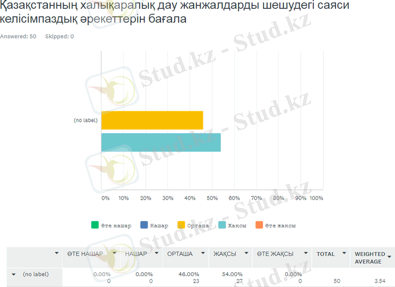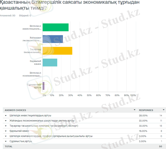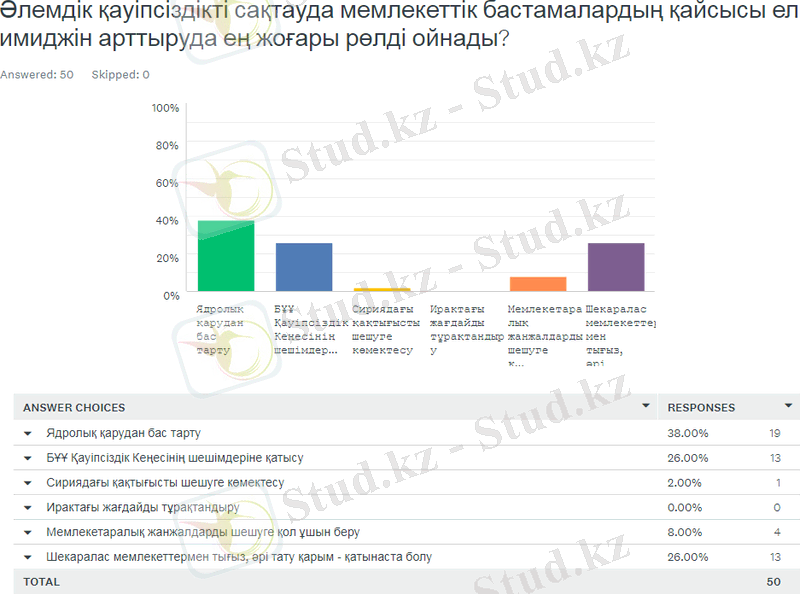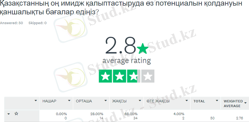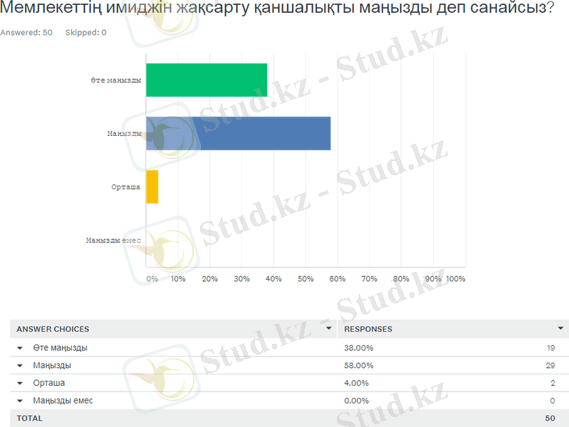 Бұл сұрақ тақырыпты ашуға бағытталған. Респонденттердің Қазақстан Республикасының имиджінің рөлін тексеру мақсатында қойылған. 50 адамның 38%-ы өте маңызды деп есептесе, 58%-ы жай ғана маңызды деп шешті. 2 адам, яғни 4%-ы имиджді жақсарту орташа маңызды деп жауап берді.