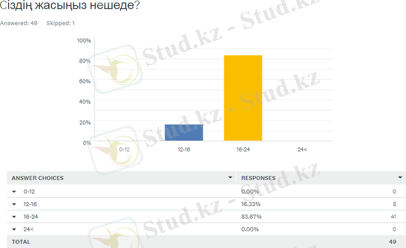 Ең алғашқы сұрақ қатысушылардың жасын анықтауға арналған, себебі адамдар түрлі жаста ойлау қабілеттері түрліше болады. Сауалнамаға қатысушылардың көп бөлігі (83. 6%) 14-26 жас аралығында болды, ал қалған (16, 33%) бөлігі 12-16 жасар адамдар болды. Бұл зерттеудің сенімділік деңгейін арттыруға, әр түрлі жастағы қатысушылардың ойын зерттеу мақсатында қажет болды.