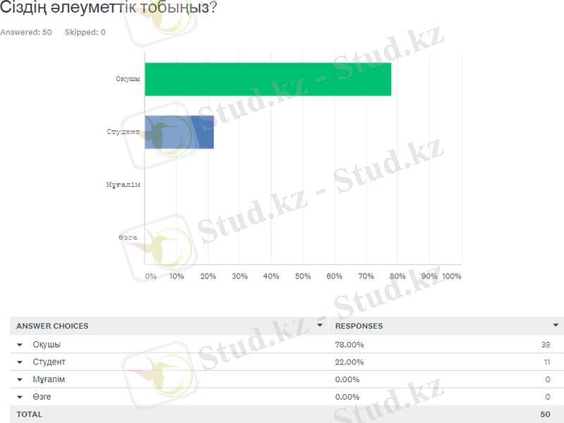Екінші сұрақ респонденттердің әлеуметтік тобына қатысты болды. 50 қатысушының арасында 39 адам оқушы болса, қалған 11 адам студенттер тобы болды. Сауалнама барысында оқушылар мен студенттердің ойларының әртүрлілігі байқалды.