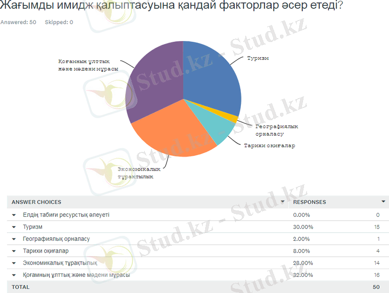 Келесі сұрақ имиджге әсер етуші негізгі факторларды анықтауға бағытталған. Заманауи ғасырда әрбір адам, мемлекет сыртқы әлеммен байланысқа ерекше тәуелді. Осы себептен БАҚ ақпараттық арна бола отырып, қоғамдық пікірдің қалыптасуына әсер етеді. Сондықтан жауап берушілердің 32 пайызы қоғамның ұлттық және мәдени мұрасын халықтың даралығын көрсетер басты фактор ретінде атады. Екінші орында туризм, оның қаншалықты дамығандығы 30 пайызды құрады. 14 адам экономикалық тұрақтылықтың маңызын ерекшелей түсті, мұнда экономикалық реформалар, инвестициялық ахуалдың тұрақтылығы мен ашықтығы тартымды имиджі қалыптастырады. 50 адамның 4-і тарихи оқиғаларды атай өтсе, қалған 1 адам мемлекеттің географиялық орналасуының ерекшелігіне мән берді.
