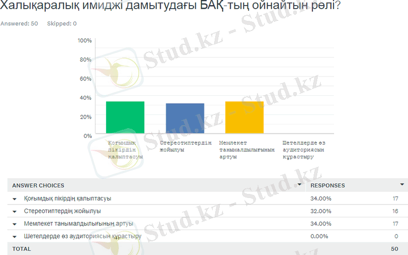 Қазақстанда БАҚ нарығы жоғары дамыған. Ол арқылы имидж қалыптасады және белгілі бір әлеуметтік бағыттың ақпараттық өнімі ретінде қоғамға ұсынылады. Белгілі бір пікірді таңып қана қоймай, баршалық талқылауға тақырып ұсынады. 6-шы сұрақта жауап берушілердің ойы бөлінді, 50 адамның ішінен 17 адам қоғамдық пікірдің қалыптасуына, 17 адам мемлекет танымалдылығының артуына теңдей дауыс берді. Қалған 16 адам қазақ халқы жайлы стереотиптердің жойылуына ерекше мән берді. Яғни, БАҚ қызметінің реттеліп отыруы да маңызды.