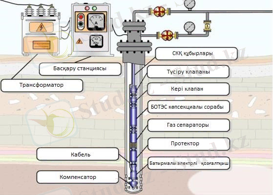ЭОСҚ құрамы және комплектісі. ЭОСҚ қондырғысы батырмалы сорғыш агрегатынан (гидроқорғанысты электроқозғалтқыш), кабельді линиядан, СКҚ колоннасынан, ұңғымалық саға жабдығынан және жер үсті электр жабдықтарынан: трансформатор және басқару станциясынан(комплекті қондырғы) тұрады. (сурет1. 6) . Трансформаторлы подстанция өнеркәсіптік жүйедегі кернеуді кабельдағы кернеу түсуін есепке ала отырып электрқозғалтқыш қысқышындағы кернеуді оптималды өлшемге дейін өзгертеді. Басқару станциясы оптималды режим кезіндегі сорғыш агрегаттарының жұмысын және қорғанысын басқаруды қамтамасыз етеді.