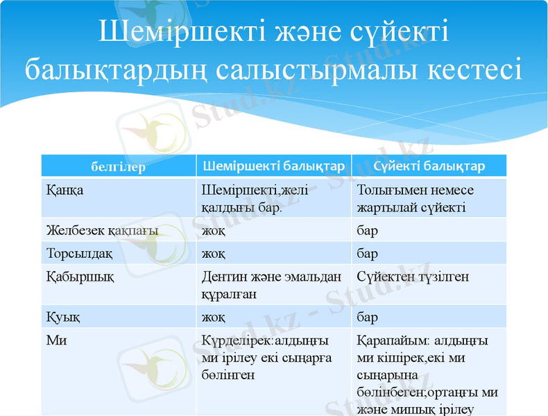2. сурет. Шеміршекті және сүйекті балықтардың салыстырмалы кестесі