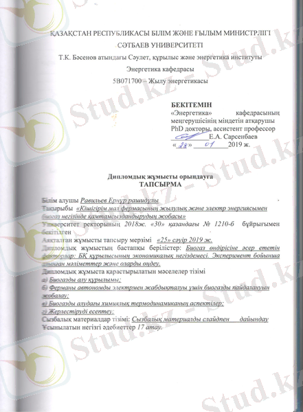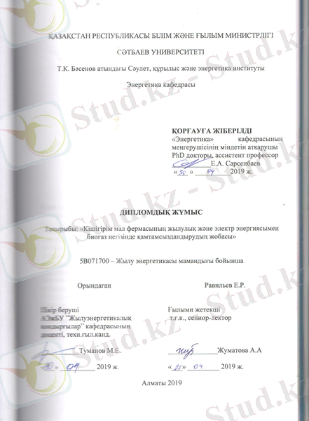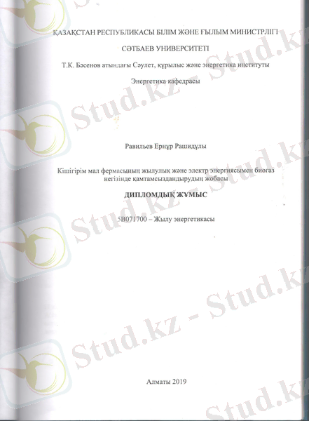 AHHОТAЦИЯДипломдық жұмысымда кішігірім мал фермасының жылулық және электр энергиясымен биогаз негізінде қамтамасыздарудың жобасы қарастырылған. Биогаз туралы жалпы мәліметтер және биогазды алу құрылымы сонымен қатар қатты қалдықтарды жағуға арналған қондырғылар, ферманы автономды электрмен жабдықталуы үшін биогазды пайдалануын жобалауы қарастырған.