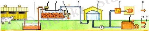 1. 1-суреттегі схемада: 1 - ауыл шаруашылық жануарларының қалдық өнімдерін сақтаудың сыйымдылығы (көң) ; 2 - өңдеуге арналған көңді қамтамасыз ететін фекальды сорғы; 3 - қазандық (реактор), шикізатты бөлшектеу және ашыту процесі; 4 - өңделген шикізатты жоюды қамтамасыз ететін элемент; 5 - ағызу құбыры; 6 - гашолдер, биогаз аккумуляторы; 7 - газды жылу энергиясына айналдыруға арналған құрылғы (газ оттығы) ; 8 - алынған жылу энергиясы; 9 - газды электр энергиясына айналдыруға арналған құрылғы (газ генераторы) ; 10 және 11 - электрогендік және жылу энергиясы, газ генераторының жұмысы кезінде алынған.