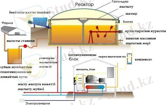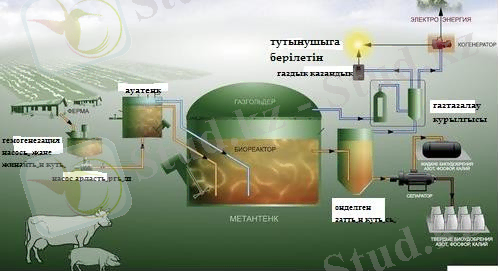 негізделеді. Шикізаттың ыдырау нәтижесінде метан, көмірқышқыл газы мен басқа газдардың қоспалары (аммиак, сутегі сульфаты, азот және т. б. ) қоспасынан тұратын биогаз алынып отыр (1. 3-сурет) .