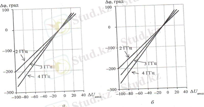 1. 2 сурет. ҚТШ сигналдың фаза өзгерістерінің келесілерге тәуелділік графигі: а - спиральдегі кернеудің өзгерісіне; б - анодтағы кернеудің өзгерісіне.