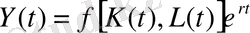 Y(t), K(t), L(t) - өнімінің, капитал және еңбектің көлемді көрсеткіштері болсын, ал y(t), k(t), l(t) - олардың өсімдерінің үзіліссіз қарқыны болсын.