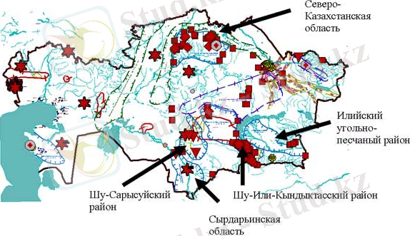 1 Cурет. Қазақстандағы уран өндіріс ошақтары мен уранға бай өңірлер және атом бомбасы жарылған өңірлер [2] .
