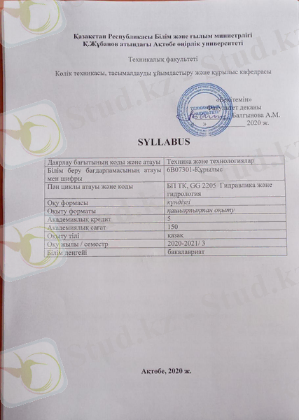 Гидравлика және гидрология пәнінің оқу-әдістемелік бағдарламасы