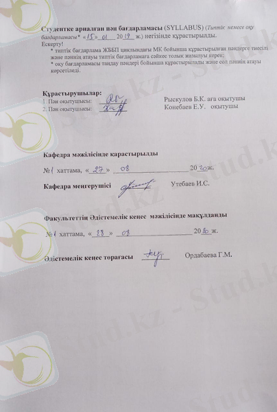 - пән оқытушысы туралы қосымша мәліметтер университеттің arsu. kz/ru ресми сайтында және университет профессорлық - оқытушылық құрамының қызметін бағалаудың рейтингтік жүйесінде көрсетілген.