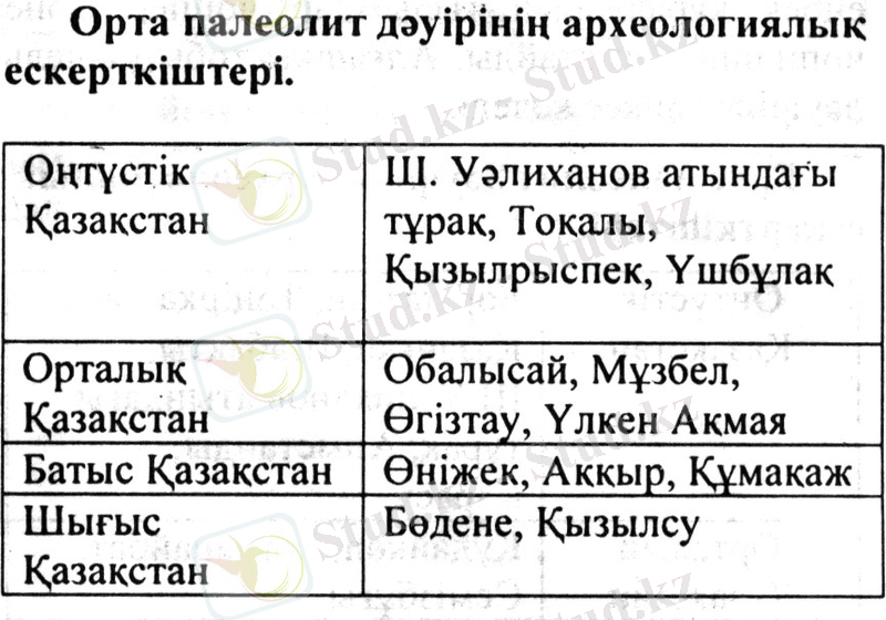 Мустье кезінде тас өңдеудің жаңа техникасы табылды. Ол оңтүстік Қазақстанда Ш. Уәлиханов атындағы тұрақ деп аталынады. Адамдар бизон, жылқы аулаған.