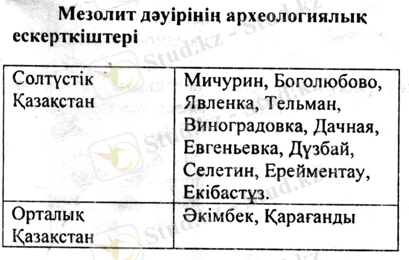 Мезолит - Қазақстанда аз зерттелді. Тек 80-90 жылдары Батыс және оңтүстік Қазақстанда археологиялық жұмыстар жүргізілді. Мезолит (орта) кезінде садақ пен жебе пайда болды. Тұрақтар өзен-көлдерге жақын болды. Мезолит тұрақтары -Қарағандыда - Әлімбек, Көкшетауда - Виноградовка, Қостанай маңында - Дачная, Маңғыстауда - Қызылсу және т. б.