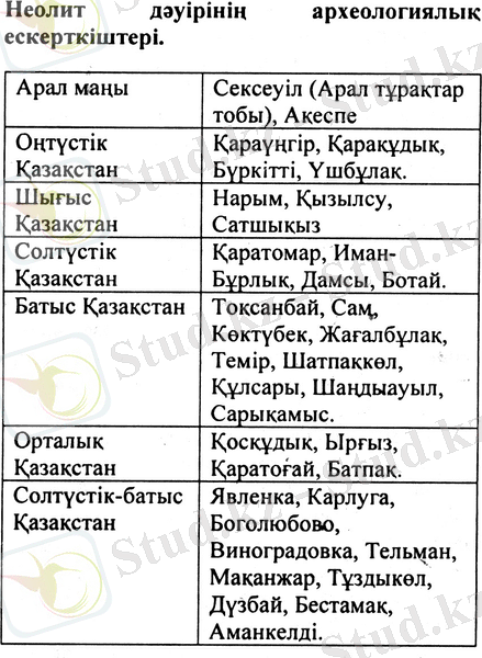 Жаңа тас ғасыры - неолит - бұл дәуірдің басы шамамен б. з. б. 7 мыңжылдық-2 мың жылдық басы. Тас өңдеудің тегістеу, бұрғылау түрі пайда болды. Басты белгісі - табиғаттың дайын өнімдерін пайдалану орнына, өндіретін шаруашылық, яғни мал шаруашылығы мен егін егу пайда болды. Қыш құмыра, тоқымашылық пайда болды. Қазақстанда 600-ден астам неолиттік, энеолиттік ескерткіш бар. Неолиттік тұрақтар орналасу сипатына қарай бұлақтық, өзендік, көлдік, үңгірлік болып 4-ке бөлінеді. Бұлақтық тұрақ көп тарады. Үй малдары пайда болды. Жылқы. От жағу пайда болды. Ескерткіштері -солтүстік Қазақстанда, Есіл өңірінде - Атбасар мен Торғай үстірті -маханжар неолиттік мәдениет; оңтүстік Қазақстанда - Қараүңгір үңгірінің неолиттік тұрағы. Атырауда Шатпакөл; Құлсары 1-5; Маңғыстауда Бозащы түбегі (Шебір), орталық Маңғыстауда Түйесу (Сенек 1, 4) .
