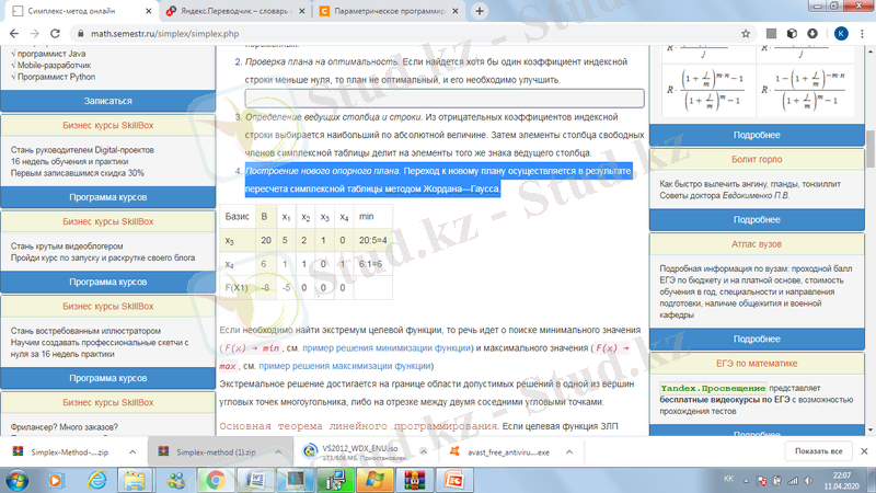 Симплекс әдісі алгоритмі келесі кезеңдерді қамтиды: