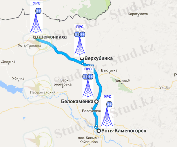 - Жұмыс істеп тұрған радиорелелік станциялар мүмкіндігінше әуеайлақтардан алыс орналасады. Құнарлы егістік жерлерді пайдалануға тыйым салынады. Усть-Каменогорск - Шемонаиха трассасын таңдаймыз. (сурет 1) .