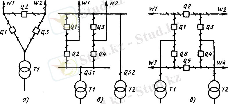 Электр қондырғысының кернеуіне, қосылыстардың санына, сенімді қуат көзі мен икемділікті қамтамасыз ету қажеттілігіне, жөндеу және техникалық қызмет көрсетудің қарапайымдылығына, әртүрлі ауыстырып-қосқыштардың сұлбалары қолданылады: бір шиналық жүйемен, бір жұмыс жасайтын және айналмалы шиналар жүйесімен, екі шиналы жүйемен, екі жұмысшымен және біреуімен Шиналардың айналма жүйелері, сақиналық тізбектер және басқалары.