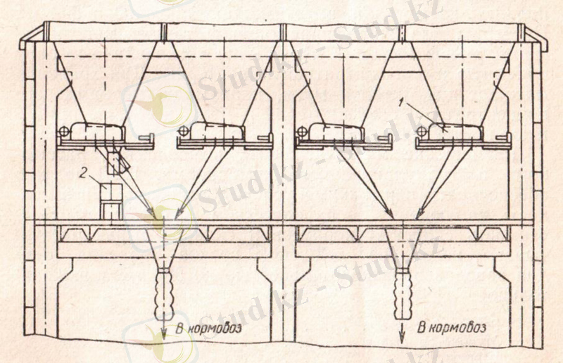 1- бұрандалы түсіргіш; 2- теміржол вагондарына дайын өнімді тиеуге арналған конвейер.