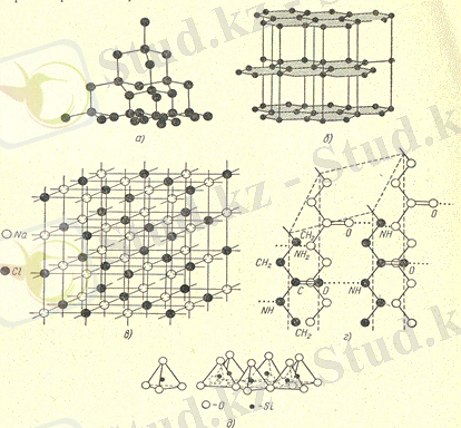 а, б - атомды (а - алмаз, б - графит) ; в, г - ионды (в - ас тұзы, г - кремний қышқылды тетраэдрлер торы) ; д - молекулалы (капрон) .