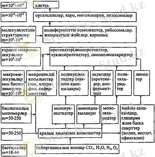 Төмендегі сызбанұсқада клетканың молекулалық ұйымдасу деңгейлері көрсетілген.
