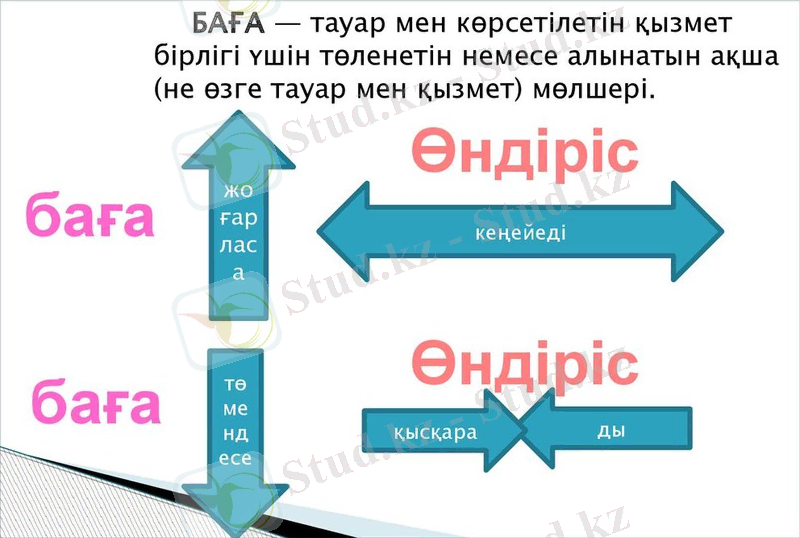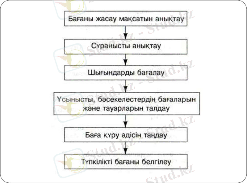 1. Нарықтық баға жасаудың ең түбегейлі ерекше белгісі ретінде тауар бағасының өндірісте, тіпті кәсіпорында емес, өткізу өрісінде анықталатынын, яғни сұраныс пен ұсыныстың ықпалына тәуелді болатынын атау қажет. Тауар бағасы және оның пайдалылығы тек нарықта ғана тексеріледі және қалыптасады. Біздің елде, өкінішке орай әлі де болса, тауар бағасы негізінен кәсіпорын шығындарына қарай қалыптасады. Оның себебі ретінде біздің еліміздегі сұраныстың ұсыныстан әлдеқайда көп болуын және монополиялардың бар болуын атауға болады.