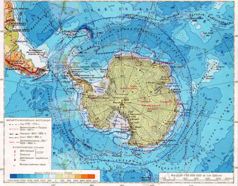 Антарктика - (грекше anti - қарсы, arktios - солтүстік) Жер шарының оңтүстік поляр аймағы. Антарктиканың табиғи шекарасы өте айқын байқалады. Ол дүние жүзілік мұхитттың беткі суларының біршама жылы және керісінше, мейлінше салқын бөліктерінің араласатын аймағы - антарктикалық конвергендену белдемі арқылы өтеді. Бұл шекара, негізінен, 48-60 0 оңтүстік ендік аралығында орналасқан. Поляр аймағын алып жатқан Антарктиканың аумағы шамамен 52 млн. км 2 , оның құрамына бетін қалың мұз жамылғысы жауып жатқан Александр І жері, Оңтүстік Шетланд, Оңтүстік Оркней, Оңтүстік Сандвичтер, Оңтүстік Георгия, Баллени аралдары мен арал топтары және құрлық жағалауын шайып жатқан, шартты түрде Оңтүстік мұхит деп аталатын - Тынық, Атлант, Үнді мұхиттарының Антарктикалық бөлігі енеді. Құрлық жағалауындағы қайраңдарда Росс, Уэдделл, Беллинсгаузен, Ынтымақ, Ғарышкерлер теңіздері бар. Уэдделл және Росс теңіздерінің елеулі бөлігін қайраңды мұздықтар басқан. Қыс кезінде мұхитттағы қалқыма мұздықтар шекарасы солтүстікте ашық мұхит айдынында 50 0 оңтүстік ендіктерге дейін жетіп, аумағы 20 млн. км 2 болады. Бір жылдық мүздың қалыңды, ы 1, 5-2 м жетеді. Көп жылдық мұздар мұзтау түрінде кездеседі. Антарктика Арктикамен салыстырғанда табиғытының қаталдығымен ерекшеленеді. Онда жер шарының ең суық полюсі орналасқан. (минус 89, 2 0 С) . [1, 372-373 б. ]