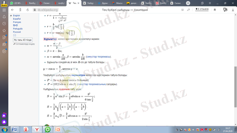 Үшбұрыштың ауданы оның екі қабырғасы мен осы қабырғалар арасындағы бұрыштың синусы көбейтіндісінің жартысына тең. Яғни S=1/2 · ah sin γ формуласымен есептеледі, γ - олардың арасындағы бұрыш.