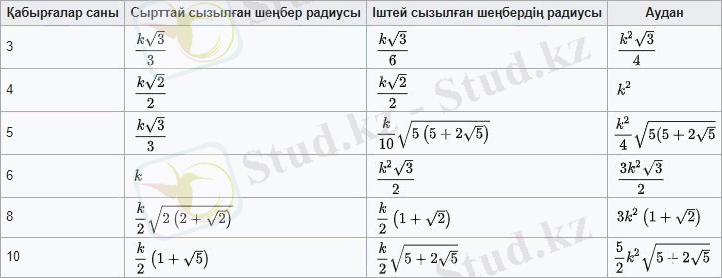 Төмендегі 1-кестеде дұрыс көпбұрыштар қабырғаларының саны және оларды сырттай және іштей сызылған шеңберлерді радиустарының ұзындығын, көпбұрыштардың аудандарын анықтайтын формулалар топталған. Дұрыс көпбұрыштың қабырғасының ұзындығы - k әріпінемен белгіленген.