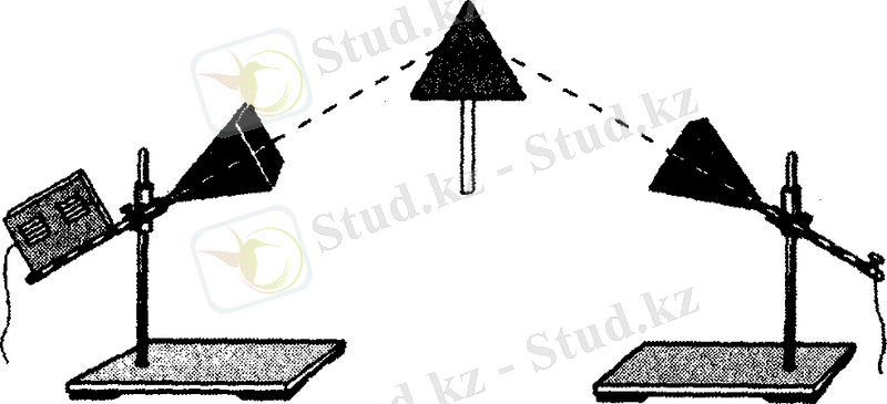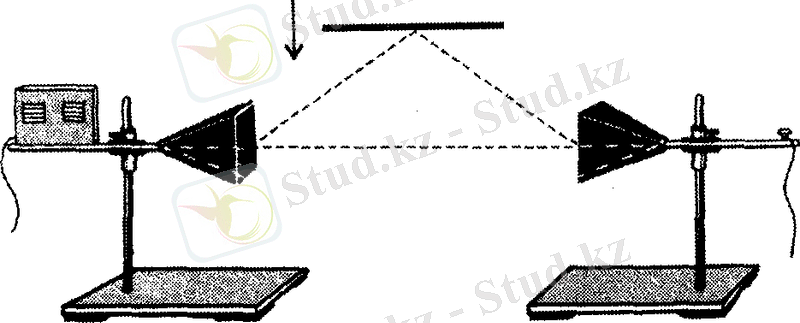 Электромагниттік толқындардың дифракциясы. Толқындардың түзусызықты таралуынан ауытқуын, бөгеттерді орағытып өтуін толқынның диф-ракциясы деп атайды. Толқын жолындағы бөгеттердің өлшемдері толқын ұзындығынан кіші немесе онымен шамалас болған жағдайларда толқын дифракциясы айқын байқалады. Электромагниттік толқындардың дифракциясын 1. 8-суретте көрсетілген қондырғының көмегімен бақылайды. Аса жоғары жиілікті генератор мен қабылдағыштың арасында жіңішке саңылауы бар металл экран тұр. Қабылдағыштың орнын ауыстыра отырып, тербеліс амплитудасының максимумдары мен минимумдары кезек ауысатынын көреміз. Бұл саңылаудың шетін орағытып өтетін толқындардың дифракциясы нәтижесінде ғана мүмкін болады. Ендеше электромагниттік толқындарда дифракция құбылысы байқалады.