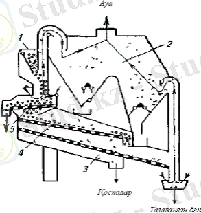 Дәнді бірінші тазалау дөңгелек тесікті үш елегі бар камерадан 1 тұратын ауалы-електі сепараторда (2-сурет) жүргізіледі. Үстіңгі (қабылдағыш) електе 5 (тесігінің диаметрі 10-20мм) ірі қоспалар ұсталып қалады: сабағы, тастар, жер түйіршіктері, екінші електе 4 (тесігінің диаметрі 6-10 мм) өлшемі дәннен біршама үлкен, қалған қоспалар жиналады. Дәннің көп бөлігі тесігінің диаметрі 1, 5-2 мм үшінші електе 3 жиналады, ал қалыңдығы кішкентай қоспалар сол тесік арқылы өтіп кетеді. Сепаратордан кірер және шығарда дәндер желдеткіш арқылы жасалатын ауа сорғысына келіп түседі. Жеңіл қоспалардың (шаң, сабан, қабық) жинақталу шамасына қарай тартылу күшінің әсерінен тұнбаланатын камераның 2 қақпағы ашылып, қоспалар ажыратылады. Тазаланған арпа сақтауға жіберіледі.