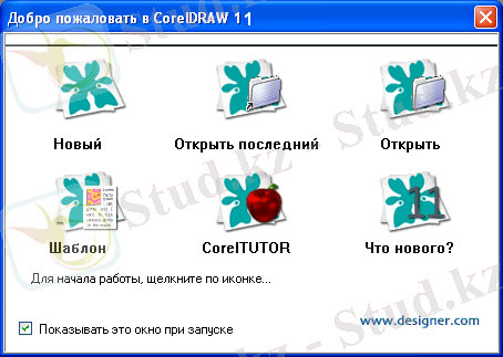 Аталған сұхбаттау терезесінің көмегімен жиі қолданылатын құжатты және құрылатын командаларды ашуға, сонымен қатар анықтамалар алуға болады. CorelDraw бағдарламасы интерфейсі қолданушыға таныс MS Office бағдарламасының негізіндегі стандартты компоненттер негізінде құрылған. Бағдарламаны іске қосқаннан кейін экранның бетіне жұмыс жасау аймағы шығады.