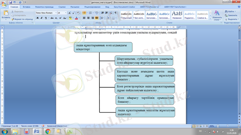 Осылайша, диплом тақырыбының өзектілігі: Ақша қаражатының бар болуы мен олар бойынша аудит және есеп айырысуларды дұрыс ұйымдастыру - есеп айырысу тәртібінің бекуіне, дебиторлық және кредиторлық міндеттемелердің кемуіне, ақша құжаттарының айналымдылығының жылдамдауына, кәсіпорынның қаржылық тұрақтылығының нығаюына алып келеді.