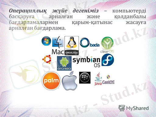 Операциялық жүйе, қыс. ОЖ - компьютерді басқаруға арналған және қолданбалы программалармен байланысы бар нақты программа. Операциялық жүйе - компьютер құрылғыларының үздіксіз жұмыс істеуін ұйымдастырушы және түрлі командаларды орындауы арқылы пайдаланышының машина жұмысын басқаруына жеңілдік келтіруші жүйелік программалар. Оның негізгі қызметі - программалардың бір - бірімен және сыртқы құрылғылармен өзара әрекетін ұйымдастыру, оперативті жадты бөлу, компьютердің жұмыс істеу кезіндеқате жіберілу сияқты түрлі оқиғаларды анықтау, дискіні жұмыс істеуге дайындау, монитор мен принтердің жұмыс істеу режимдерін орнату, пайдаланушының программасын іске қосып, оны орындау т. б. . Яғни ОЖ - машина жұмысын басқаруға толық жеңілдік беретін жүйе. Ол осы үшін арналған иілгіш не қатты магниттік дискіге жазылып қойылады. Сондықтан ОЖ - ны дискілік операциялық жүйе ( ДОЖ, не DOS ) деп те атайды. Дербес компьютерлер үшін кең тараган оиерациялық жүйелерге МS (РС) DOS, Windows 95, Windows NT, OS/2, UNIX жатады, Дербес компьютерлерлерге арналған операциялық жүйелердің барлығы да тек бір адамдық болып табылады. Расында да екі адамның бір мезетге бір компьютерде жұмыс істеуін елестету қиын ғой. WINDOWS 95, WINDOWS NT, OS/2, UNIX көп мақсатты жүйелер болып саналады. Көп мақсаттылық - бір компьютерде бір уақытта қатарласа бірнеше есепті шығару мүмкіндігі немесе бірнеше әрекеттің қатар атқарылып жатуы. Мысалы, Сіз мәтін көшіріліп жатқан шақта ойнап та отыруыңызға боладь, өйткені бұл жұмыстарды әртүрлі қүрылғылар атқарады немесе ол қүрылғылардың жұмыс жылдамдығыадамның жылдамдығынан өте жоғары болып келеді. Көптеген ІВМ - үйлесімді компьютерлер дискілік МS DОS операциялық жүйесі мен көп терезелі WINDOWS графикалық операциялық жүйесін пайдаланады. Операциялық жүкелер көптеген функцияларды орыңдайды: информацияны дискіге жазу-оқуды жүзеге асырады, мәліметтер сақтауды ұйымдастырады, компьютер құрылғыларының өзара байланыста жұмыс істеуін, барлық қолданбалы программалар жұмысының орындалуын қамтамасыз етеді. Бұл жүйе ЭЕМ іске қосылғаннан кейін иілгіш не қатты дискіден алғашқы жүктелетін кещенді программа болып табылады. Белгілі бір қосымша қызмет атқаруға керекті программалар тобы утилиттер болып табылады. Оларға мысал ретінде антивирустік (вирустерге қарсы) программаларды, мәліметтерді архивтеу (кысу) программаларын, компыотердің: жұмыс істеу қабілетін (диагностика) тексеретін программаларды (тест ирограммалары) айтуға болады.