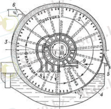1-барабан; 2 - бөлімдер; 3 - Тарату басы; 4 - шұңқыр; 5 - тұнбаны алуға арналған пышақ; 6 - тұнбаны жууға арналған су таратқыш; 7, 8 - сәйкесінше сүзілген сұйықтық пен жуу суын соруға арналған құбырлар; 9-сығылған ауаны беруге арналған құбыр.