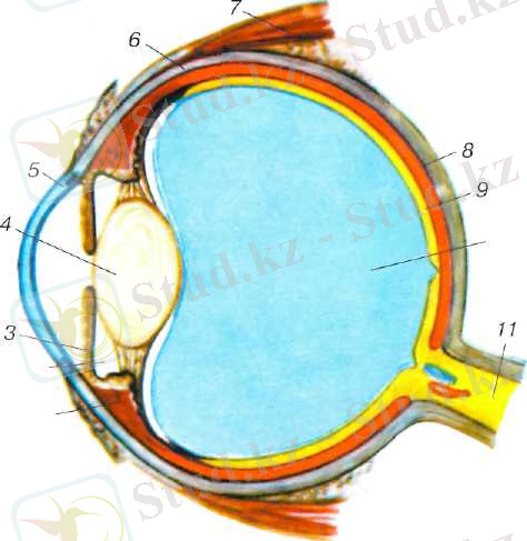 1 - бүршікті дене; 2 - артқы к амера; 3 - нұрлы қабық; 4 - бұршақ; 5 - қасаң қабық; 6 - ақ қабық; 7 - жоғары тік бқлшықет; 8 - меншікті тамырлы қабық (хориоидея) ; 9 - тор қабық; 10 - шыны тәрізді дене; 11 - көру нервісі.