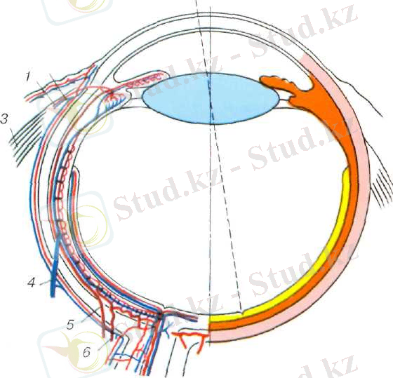 1 - алдыңғы цилиарлы артерия; 2 - алдыңғы цилиарлы вена; 3 - ішкі тік бұлшықет ; 4 - иірімді вена; 5 - артқы ұзын цилиарлы артерия; 6 - артқы қысқа цилиарлы артерия.