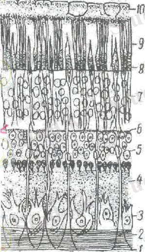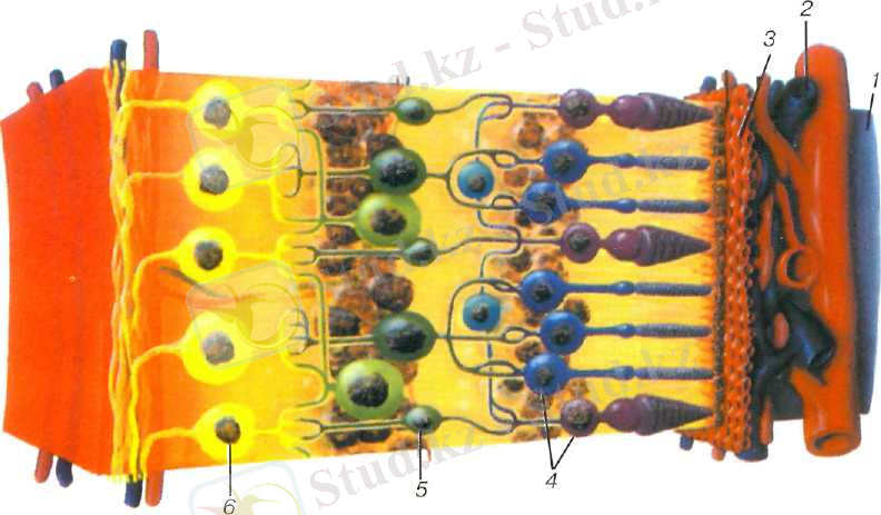 1 - ақ қабық ; 2 - хориоидея; 3 - Брух мембранасы; 4 - неироэпителии; 5 - биполярлы клеткалар; 6 - ганглиозды клеткалар.