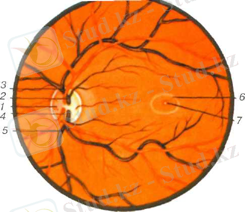 / - көру нерві дискісі; 2 - тор қабықтың орталық венасының жоғарғы тармағы; 3 - тор қабықтың орталық артериясының жоғарғы тармағы; 4 - тор қабықтың орталық артериясының төменгі тармағы; 5 - тор қабықтың орталық венасының төменгі тармағы; 6 - сары дақ; 7 сары дақтың орталық шұқыры .