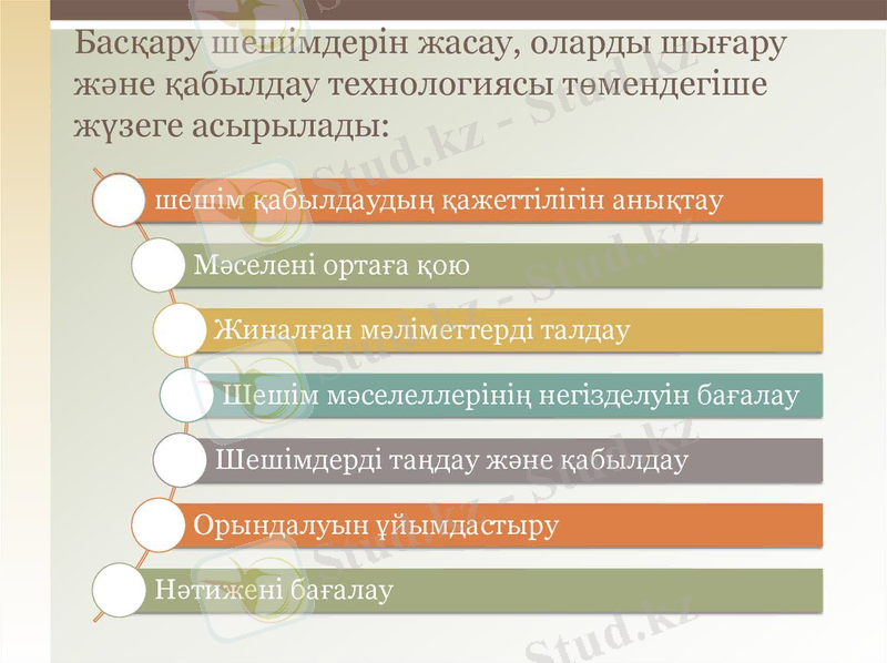 1. Басқару қызметі процесінде шешім қабылдау ең қиын мәселе. Шешім қабылдау басқару процесінің міндетті, қажетті бөлігі. Басшының кез келген әрекеті іс жүзінде белгілі бір шешім қабылдаудан басталады. Кәсіпорынның және ондағы бөлімшелер қызметінің нәтижесі басшының дер кезінде шешімді дұрыс қабылдау қабілетіне, әрі оны жүзеге асыра білуіне, ал оның жеделдігі мен дұрыстығы басшының тәжірибесі мен біліміне байланысты. Егер ол өндірісті, технологияны және адамдарды жақсы білетін болса, жұмыс тәжірибесі мол болса, онда оған шешім қабылдау қиынға түспейді.