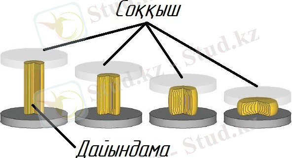 және үстіңгі жақтары соққыштың пішінін алып қалады, яғни металл асты- үстінен шектелген, бірақ жанына қарай металдың «ағуы» еркін. Сондықтан соғуды кейде еркін соғу деп те атай береді .