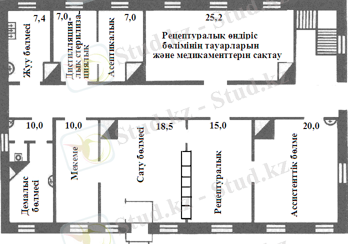 Медициналық ұйымдардың дәріханалары медициналық ұйымына тиісті аумақта оқшау тұрған ғимаратта немесе медицина ұйымдары мен мекемелерінің ғимаратының бірінші қабатында орналаса алады, бұл жағдайда бөлек кіретін есіктері болу қажет. Төменде жұмыс орнының саны минималды өндірістік дәріхана бөлмелерінің жоспары берілген.