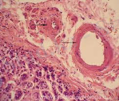 3-сурет . Гиалиноз стенки центральной артерии селезенки. Стенки центральных артерий утолщены и окрашены гомогенно в ярко-розовый цвет, вследствие отложения гиалина, который хорошо воспринимает кислые краски (эозин) . В других артериях наряду с гиалинозом имеется наличие светло-розовой гомогенной массы (цитоплазматическое пропиты-вание) .