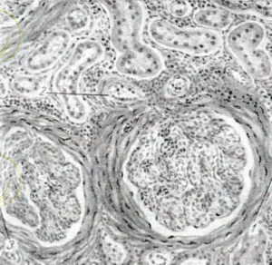 Микроскоптың аз өсуімен Шумлянскийдің капсуласында күрт өзгерістер байқалады. Капсула едәуір қалыңдатылған, эозинмен қызғылт-қызыл түске боялған кең белдеу пайда болады. Сақталған жасуша ядролары өте аз, мальпигиялық гломерулалардың қуысы тарылған.