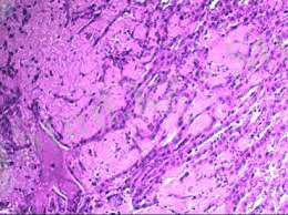 Микроскоптың орташа ұлғаюымен капсула кең, біркелкі боялған, біртекті жіптерден тұратындығын көруге болады, олардың арасында ұзартылған ядролары бар жасушалар аз болады.