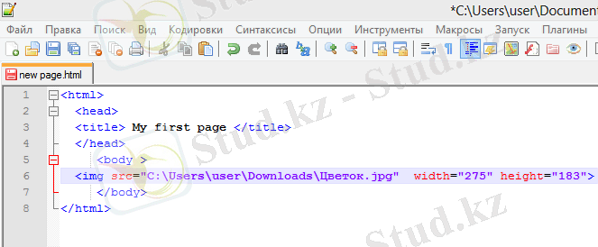 Сонымен, бірінші бөлімде веб беттің не екенін қарастырдық, ал бұл бөлімде, веб параққа сурет қоюды қарастыратын боламыз. Ең алдымен біз керекті суретті таңдап алуымыз қажет ол үшін бізге суретті интернет арқылы жүктеу қажет немесе компьютерде бұрыннан бар суреттерді қолдануға болады, бастысы сурет бүлінбеген сапасы жақсы болуы шарт. Сонымен, суреттегідей кодты жазып шығамыз (7. сурет)