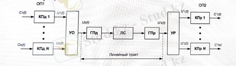 Диаграммада көрсетілген : КПд - канальный передатчик; УО - устройство объединения каналов; ГПд - групповой передатчик; ЛС - линия связи; ГПр - групповой приемник; УР - устройство разделения; КПр - канальный приемник