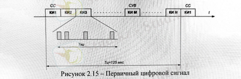 Бастапқы сандық сигналдың құрылымы N - 34 арна аралықтарын орналастыратын цикл деп аталатын іріктеу кезеңіне тең кезеңдерге бөлінеді, 2. 15-сурет. Бір таңбаның берілу уақыты сағат интервалы т деп аталады, ft = 1 / T мәні сағат жиілігі деп аталады. Ағымдағы импульстің ұзақтығы сағат аралығынан аз немесе оған тең болуы мүмкін. Жүйенің импульстік-кодтық модуляциясы кеңінен қолданылады, онда сигналдың жылдамдығы Q=T/τи=2 болады.